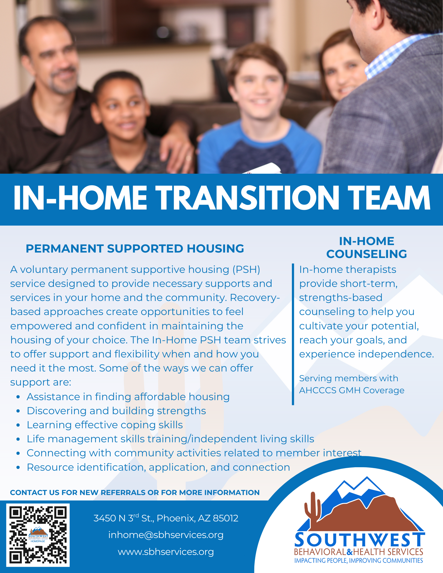 A voluntary permanent supportive housing (PSH) service designed to provide necessary supports and services in your home and the community. Recovery-based approaches create opportunities to feel empowered and confident in maintaining the housing of your choice. The In-Home PSH team strives to offer support and flexibility when and how you need it the most.