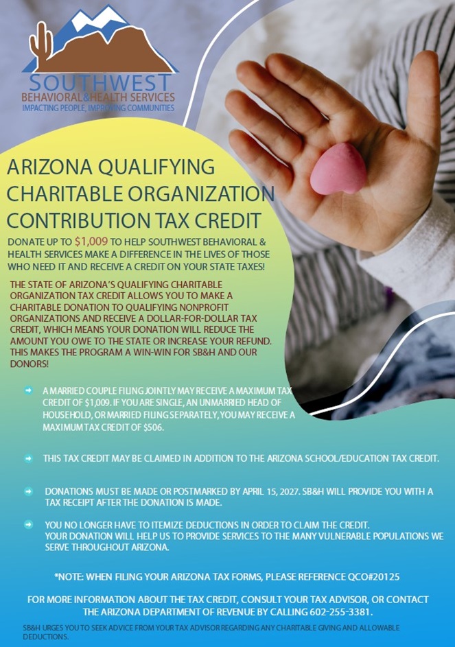 Southwest Behavioral & Health Services is a 501(c)3 organization that qualifies for the Arizona Charitable Tax Credit. Donate now and get it back on your Arizona Tax Return.